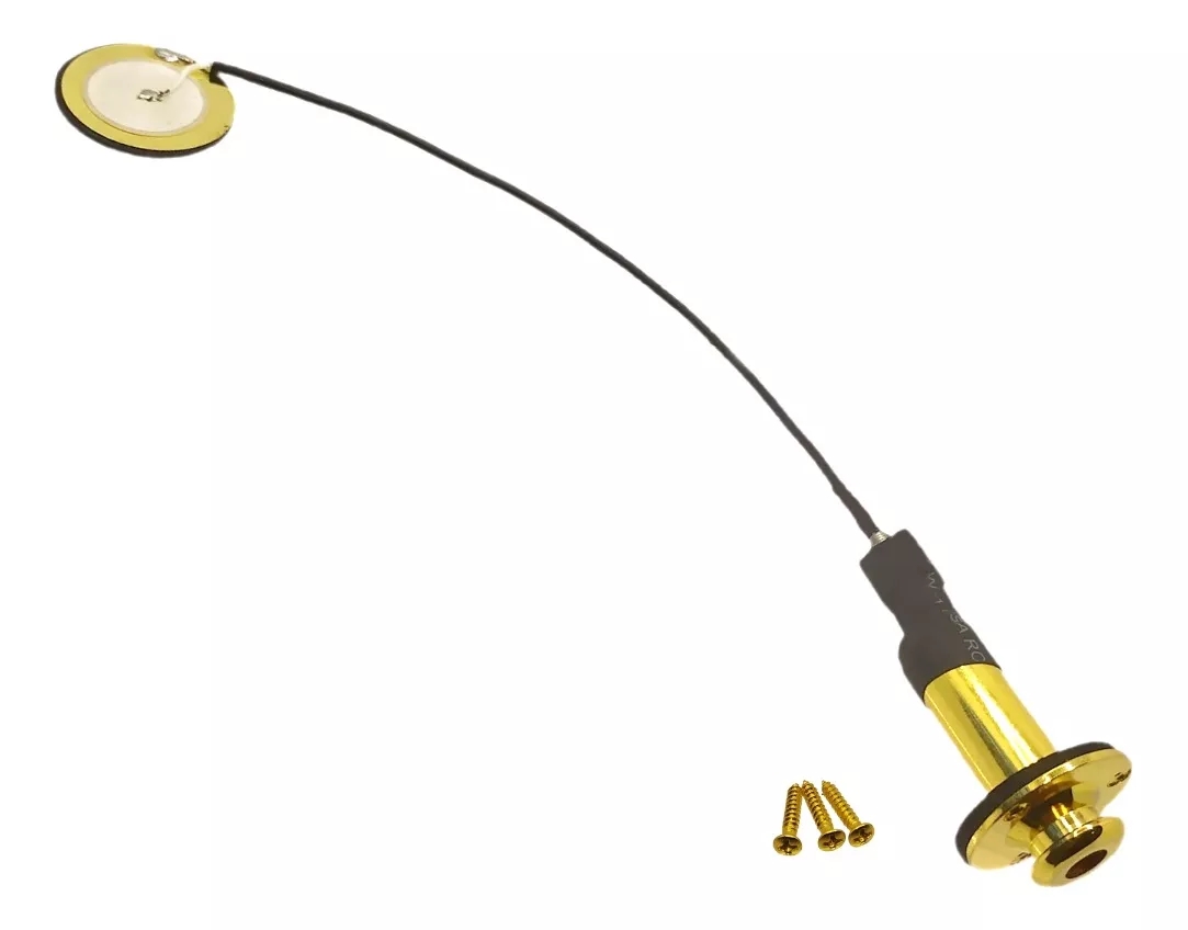 Captador piezo de contato com jack dourado, ideal para instrumentos acústicos de pequeno porte como cavaco, cavaquinho, banjo e ukulele. Captura diretamente a vibração da caixa acústica, proporcionando uma sonoridade natural e equilibrada. Fácil de instalar, sem necessidade de furos ou alterações estruturais no instrumento.